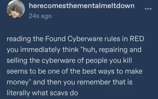 41Accidental Villainy [Cyberpunk RED]lemmy.blahaj.zonetgirlschierke@lemmy.blahaj.zone to RPGMemes @ttrpg.networkEnglish · 44 minutes ago9