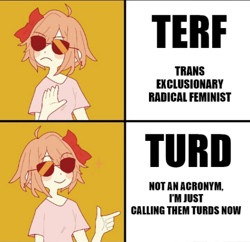 i’ve seen FART before. Feminism Appropriating Reactionary Transphobe, i think it stood for.