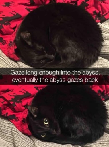 I have a black cat and an Abyssinian, so I like to say can stare into the Abyss or scream (quietly) into the void any time I want, lol.