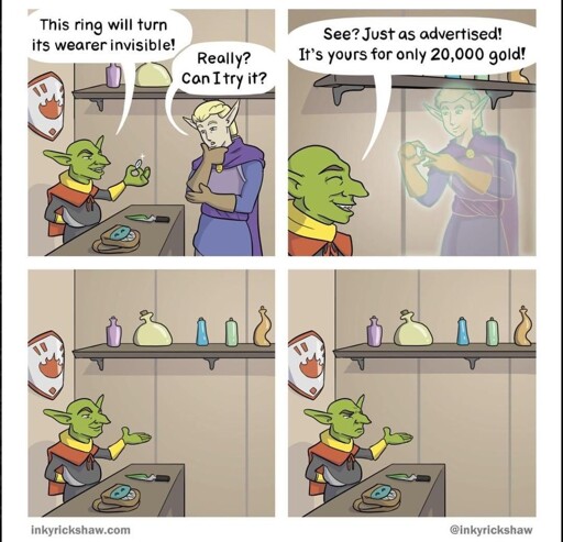 That could make for a fun little side plot setup. Whole town is convinced it’s haunted, but it’s just some guy who doesn’t have a good grasp on common stuck in a cursed ring of invisibility.