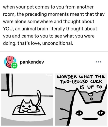 One of mine just screams from the other end of the house and expects me to come to her. She’s definitely thinking about me, but in a “Human! Come here and entertain me!” kind of way…