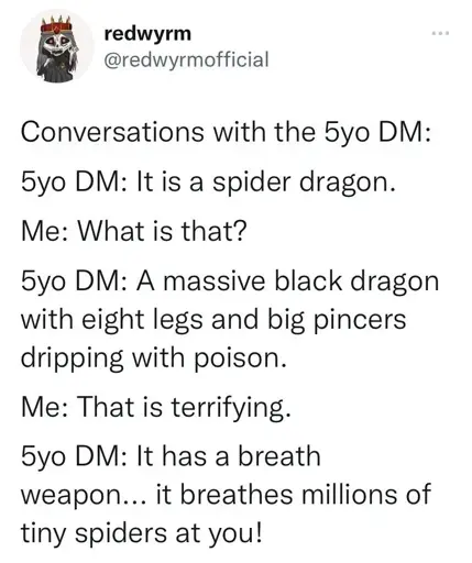 Stamets@lemmy.dbzer0.com to RPGMemes @ttrpg.network · 1 day agoSpider Dragon...lemmy.dbzer0.com415878
