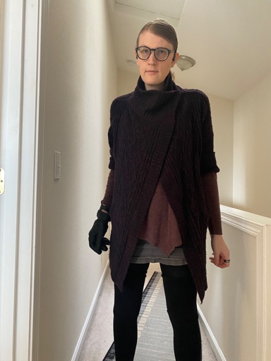 Wow! I love your style. That layered look with the deep purple cardigan is just awesome. The gloves and skinny pants are a nice touch, too.