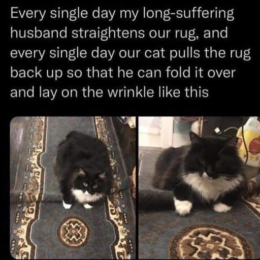 Long suffering cat. Every single day your dumbass husband fucks up his rug.