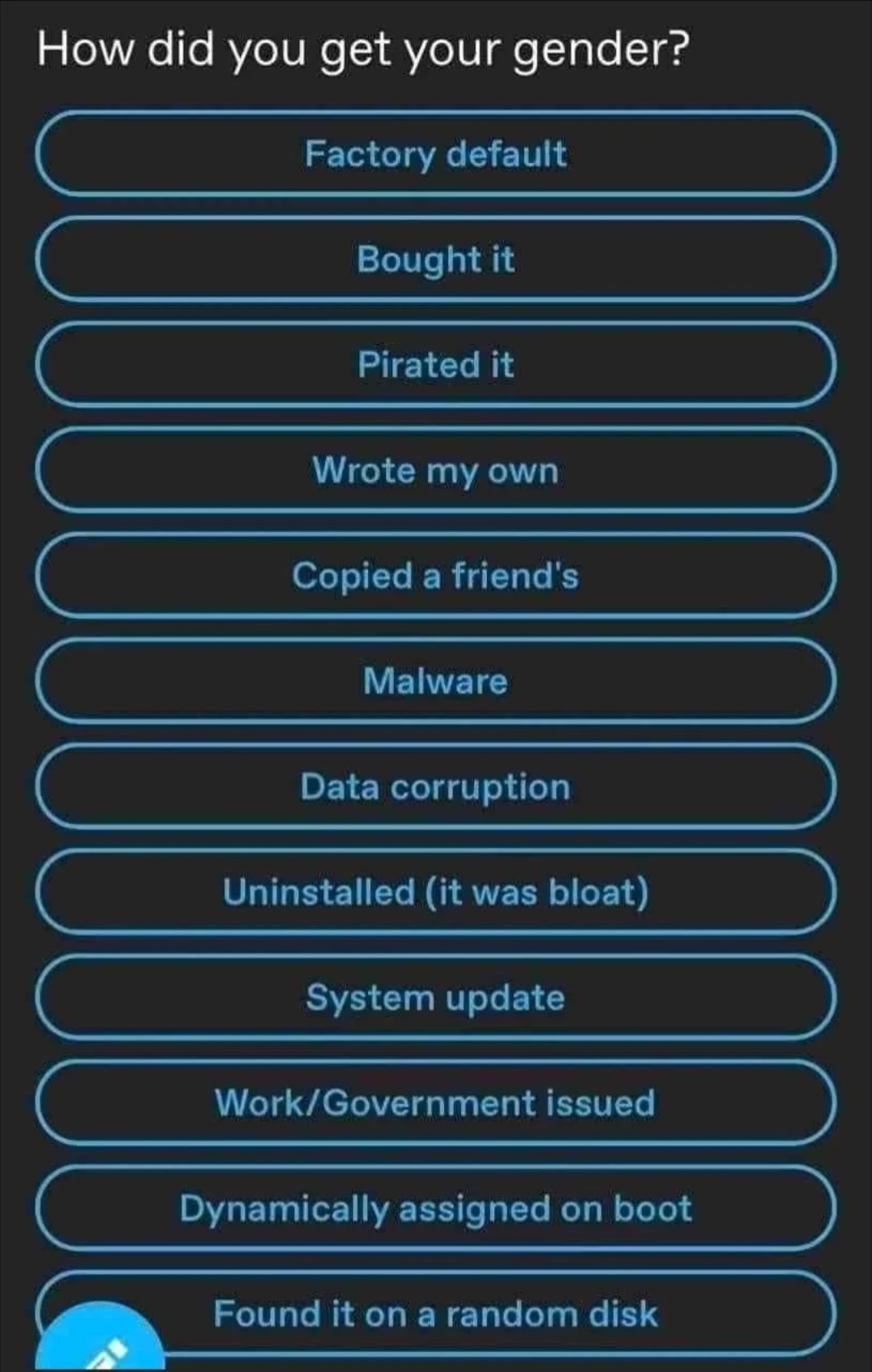 That all said, it’s probably impossible to post anything featuring a trans person without it being “political.” These also aren’t boomer memes for the most part, but I probably don’t have any of those in the first place. However, these should meet the bill of being mostly non offensive unless trans topics themselves are inherently not allowed.