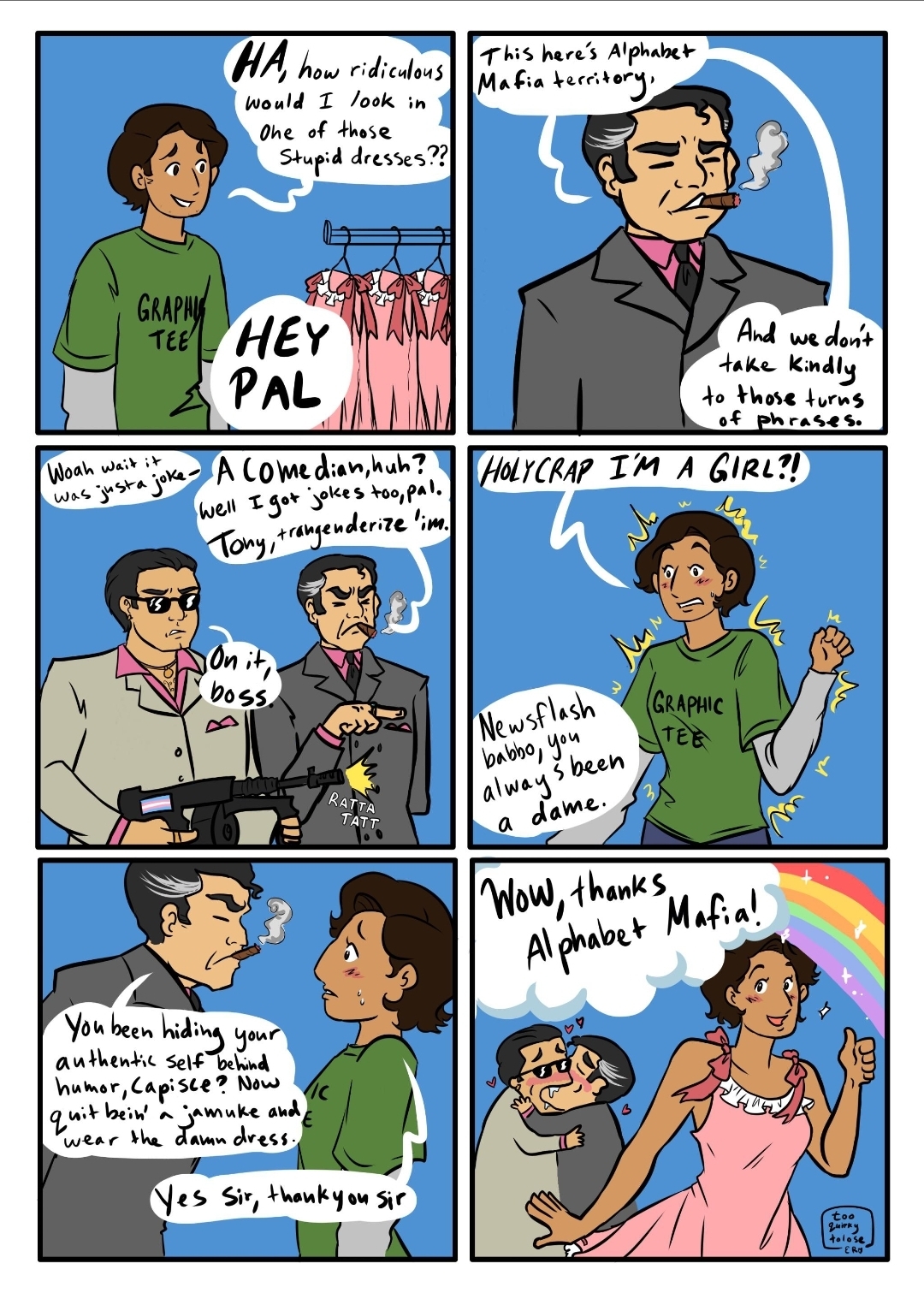 This one just has a character wearing a trans flag sweater.