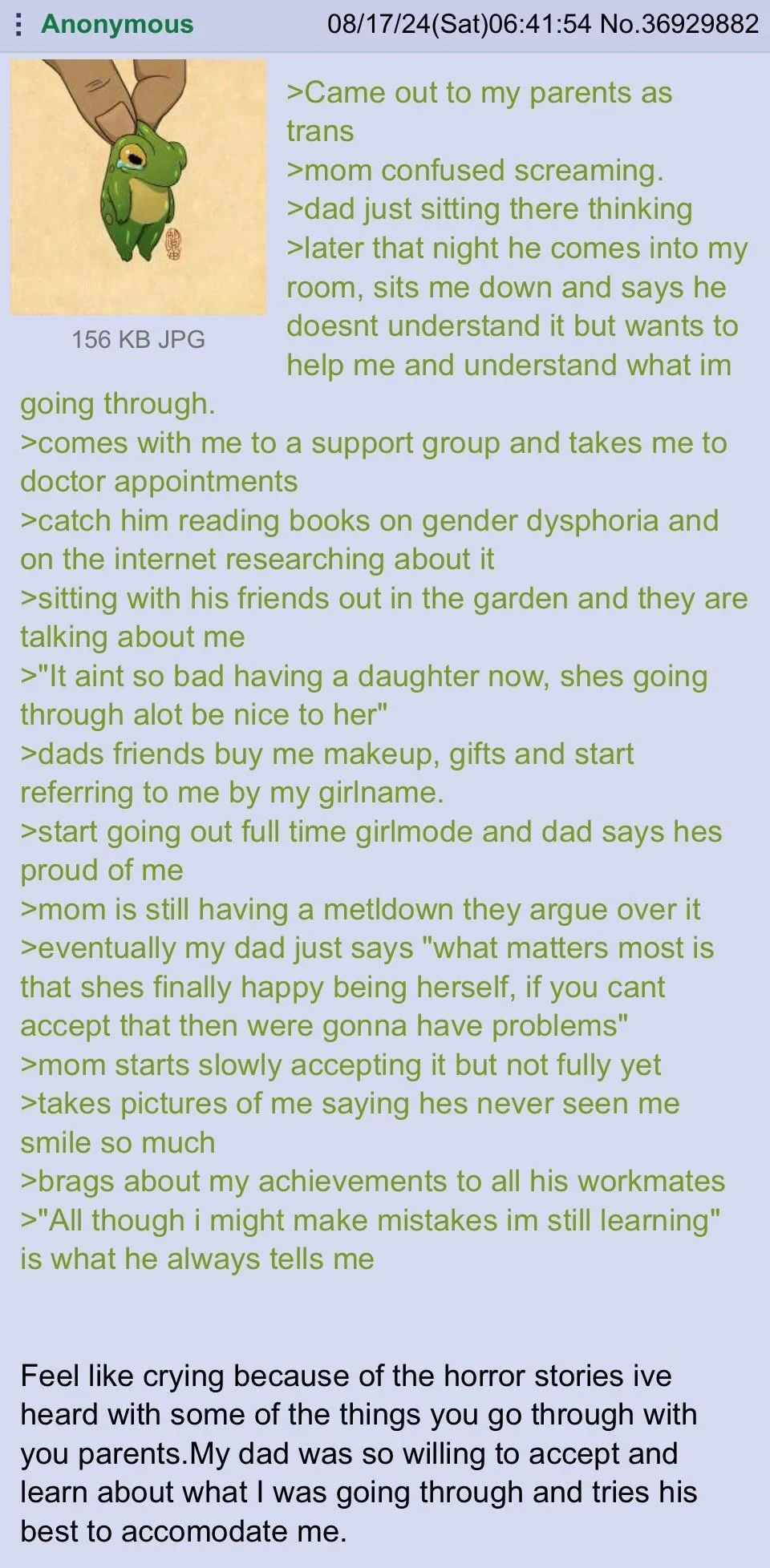 By politically agnostic and trans positive, I mean that it just treats trans identities as a fact of life. Work friendly and boomer style are needed to fit posting expectations.