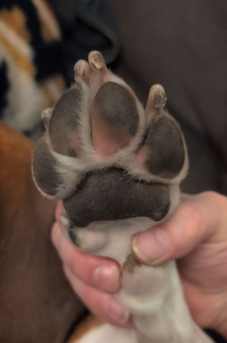 Bit of foam, drool on top of head. Those are real feet, I know they look like some AI mistake 😄