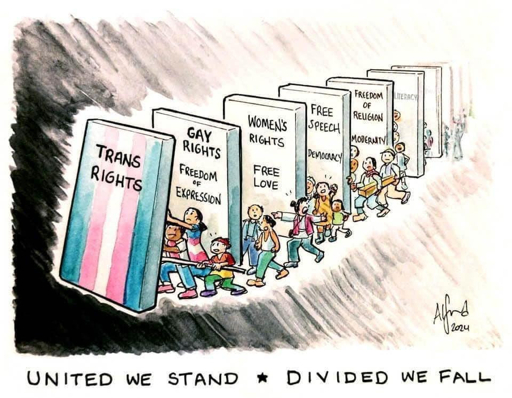 I think a generous interpretation of this comic could be that trans’ rights are everyone’s rights. Without them, no one has any.I feel like in these times any ally is an ally - we can’t afford to lose them. It sucks, though. I agree with you, and that’s why when we have a new ally, I want to let them take it in, and then explain step by step inasmuch the time allows us to.