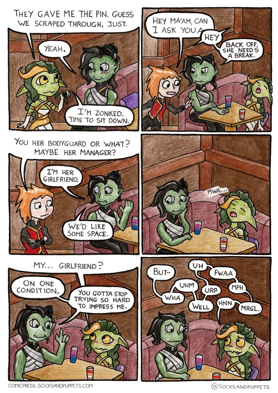 Hey OP, its ok to ignore this question since its more a curiosity thing about you. Since your 2 main characters for a few weeks now are from the LGBT+ crowd, might I guess that you might too ? Because I love the attention to details with the drinks