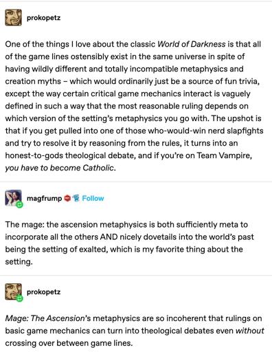 It would truly be a World Of Darkness if people didn’t include at least 1 run-on sentence stating how much they appreciate and acknowledge the other person’s worldview before respectfully disagreeing